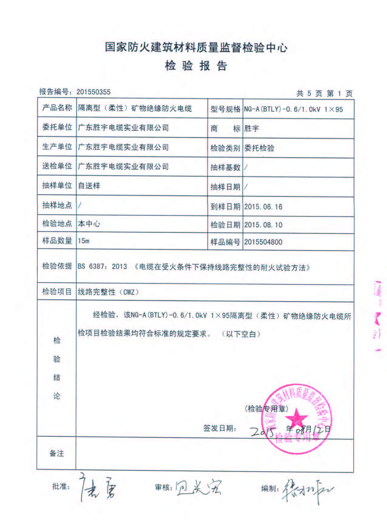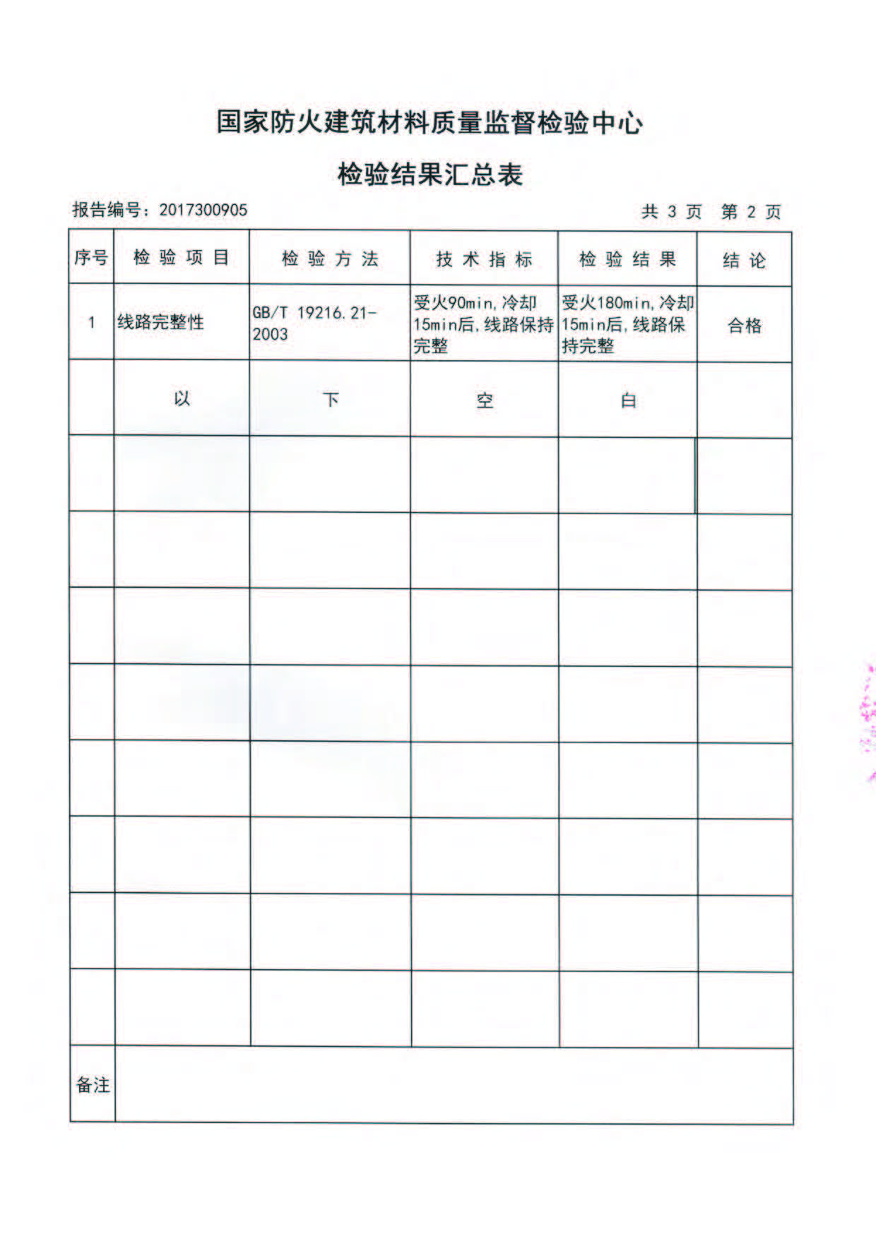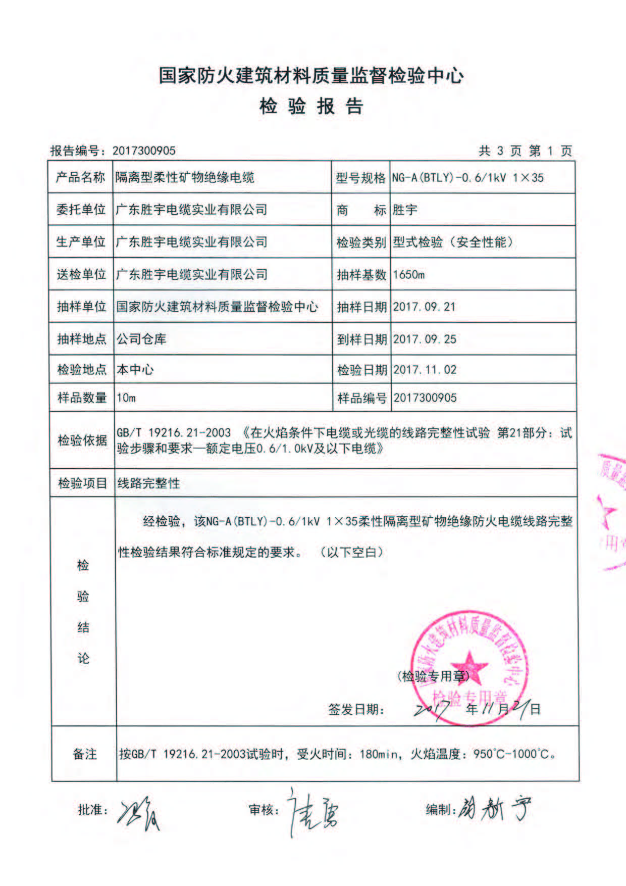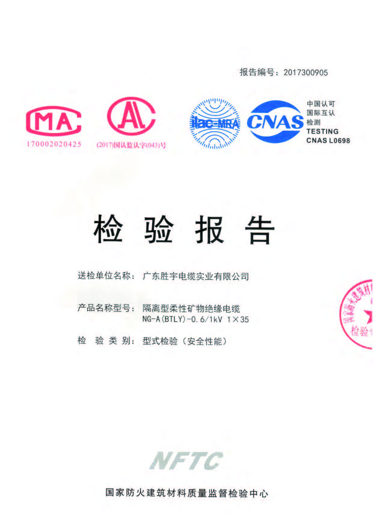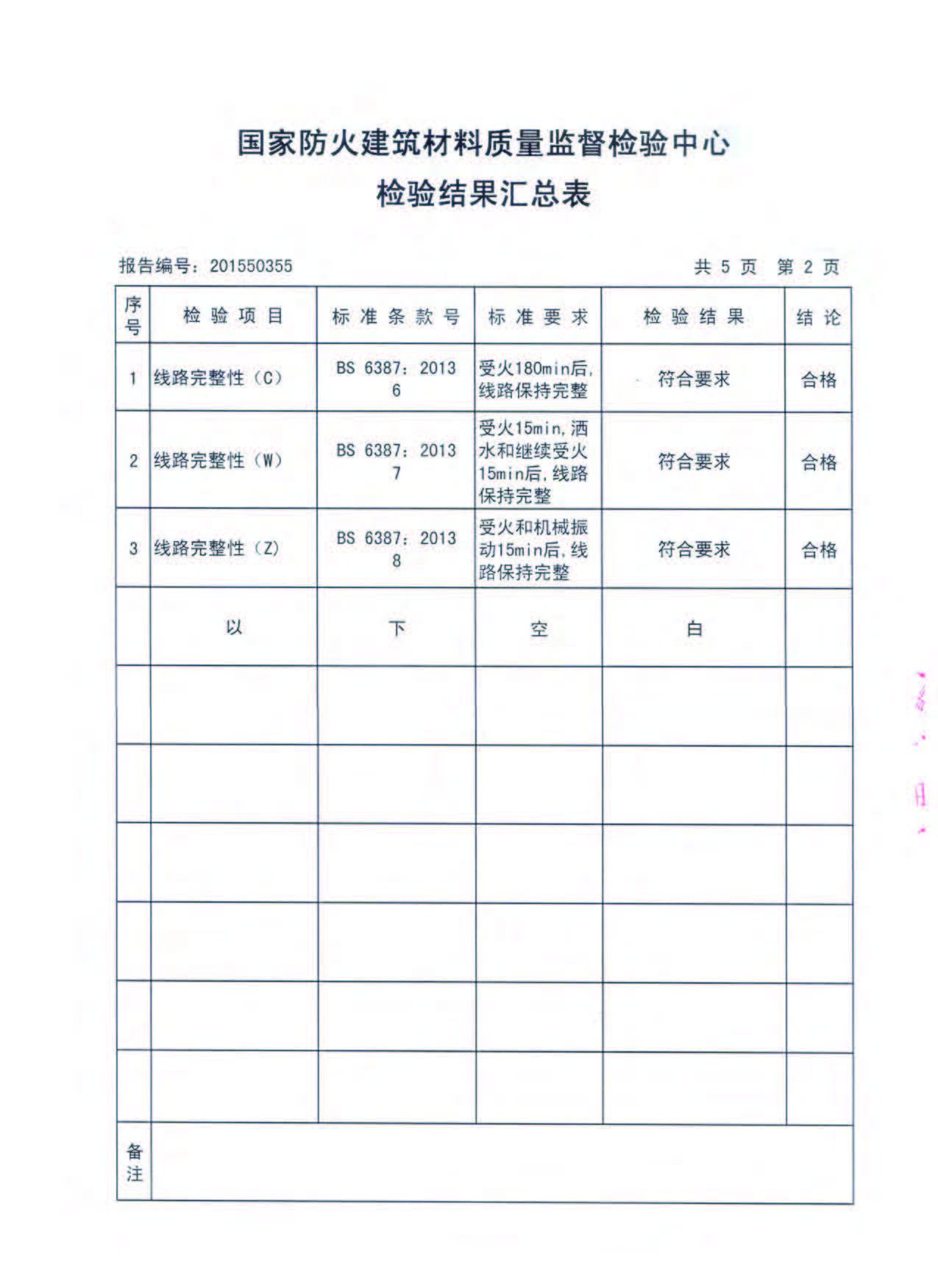標準中的3個試驗,每做一個新實驗都得換一個新的樣品,勝宇礦物絕緣電纜可以輕松遵守和承受最繁重的等級類別C、W、Z,甚至3個試驗中整個過程中使用同一個電纜樣品不需更換。