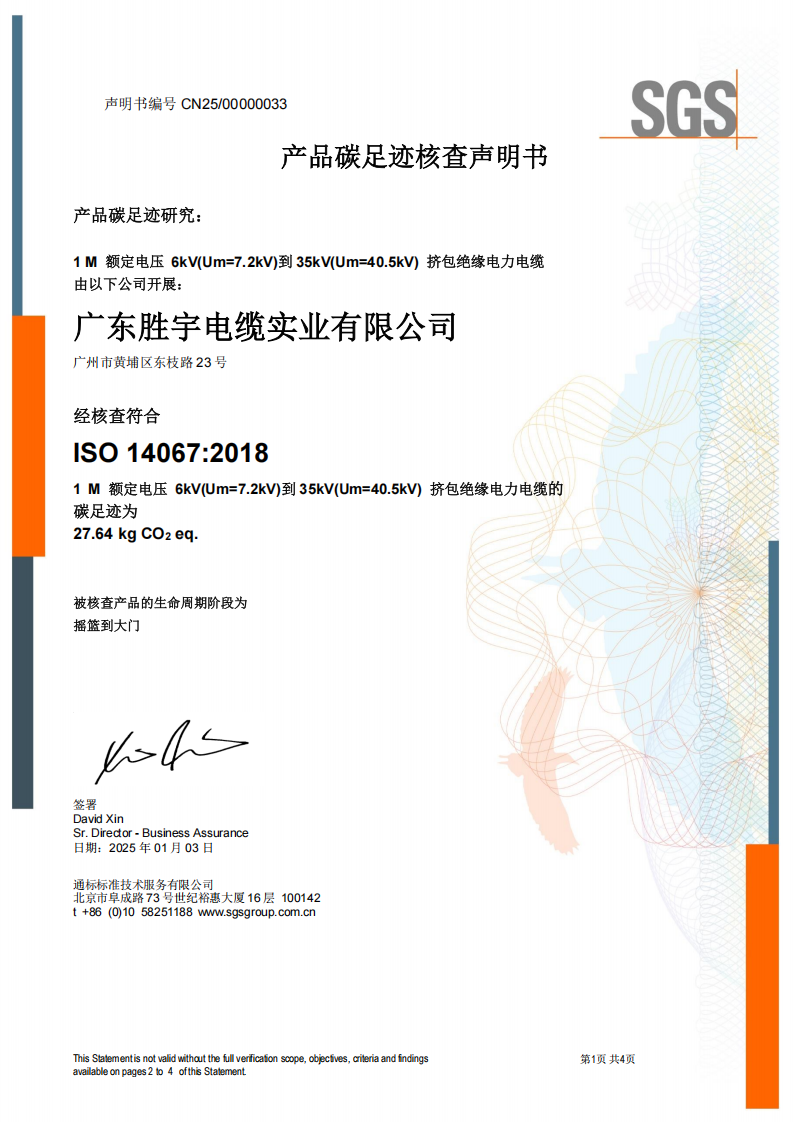 2025年1月,廣東勝宇電纜實(shí)業(yè)有限公司成功獲得了專業(yè)認(rèn)證機(jī)構(gòu)--通標(biāo)標(biāo)準(zhǔn)技術(shù)服務(wù)有限公司(SGS)頒發(fā)的產(chǎn)品碳足跡核查聲明書、產(chǎn)品生命周期評價(jià)核查聲明書。標(biāo)志著勝宇電纜在推進(jìn)綠色低碳環(huán)保、實(shí)現(xiàn)可持續(xù)發(fā)展方面又邁出了關(guān)鍵一步。